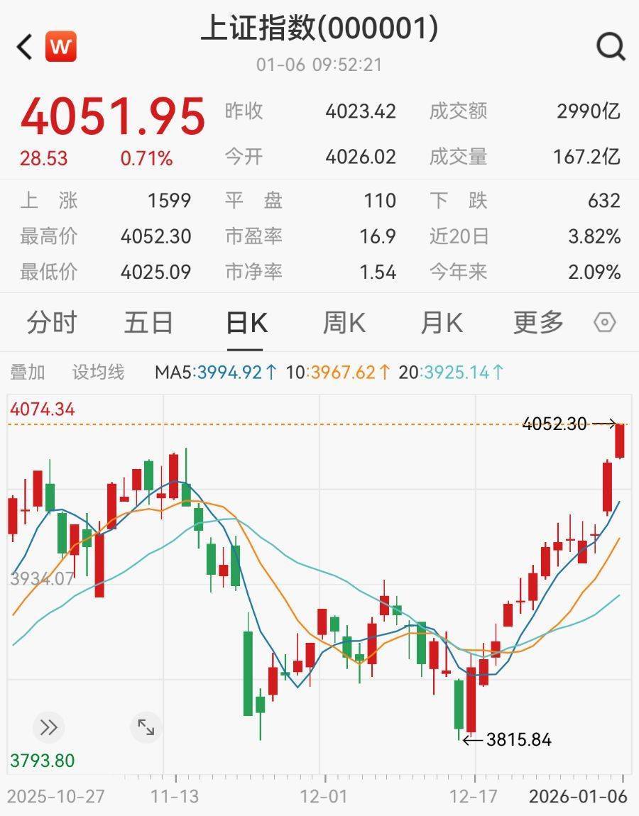 1月6日,上证指数突破前高4034.08点,刷新10年来新高。截至9:52,报4051.95点,涨0.71%,延续“开门红”走势。